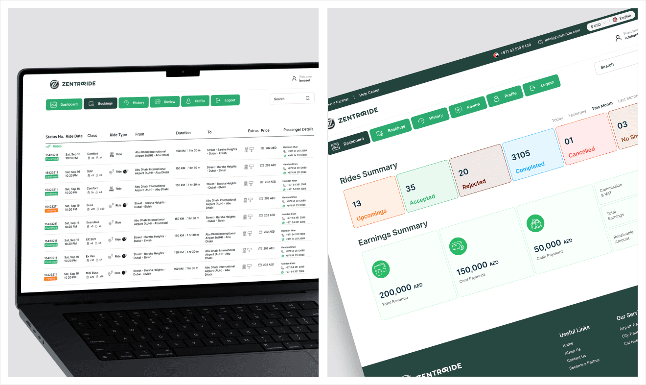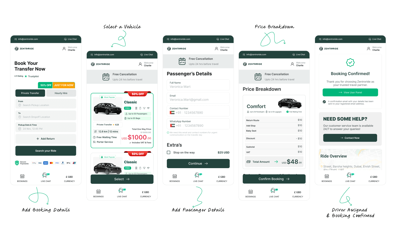 The booking flow was streamlined into clear, guided steps, pricing was made transparent, and visual hierarchy was improved to support faster decision-making. Alongside the user experience, I designed dashboards for admin and drivers to ensure operational efficiency across the platform.